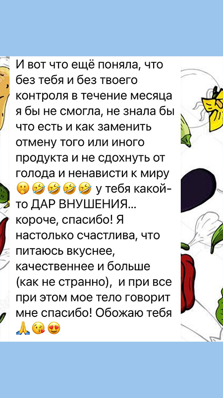 С вами будут работать лично Ирина Гейкало, а также профессиональные нутрициологи из нашей команды. Кроме этого, у вас будет возможность написать по любым вопросам в техническую поддержку.